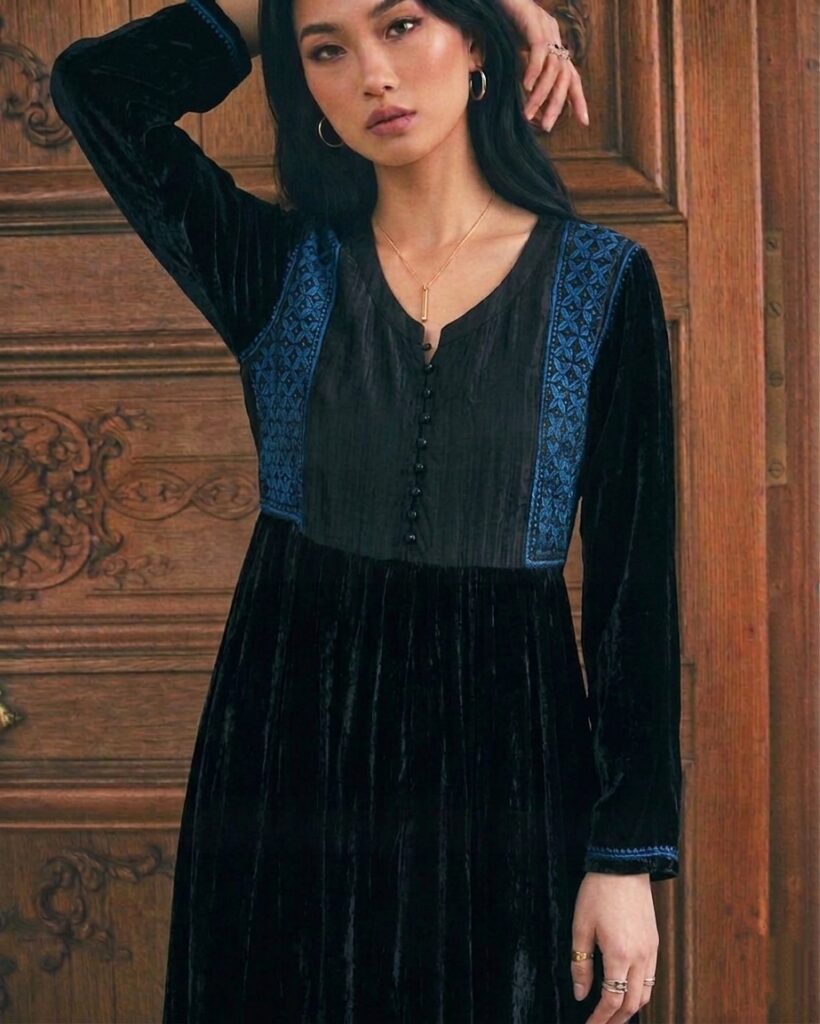 这条黑色的丝绒连衣裙,便是这样诞生的。蓝色棉线勾勒的 floral 纹样,在深色丝绒上静静绽放。每一朵花,每一片叶,都由勒克瑙的工匠一针一线绣出。她们的手艺来自母亲,母亲的手艺来自祖母。这条裙子穿在身上时,你会觉得它不只是布料,而是一段被缝进去的时光。